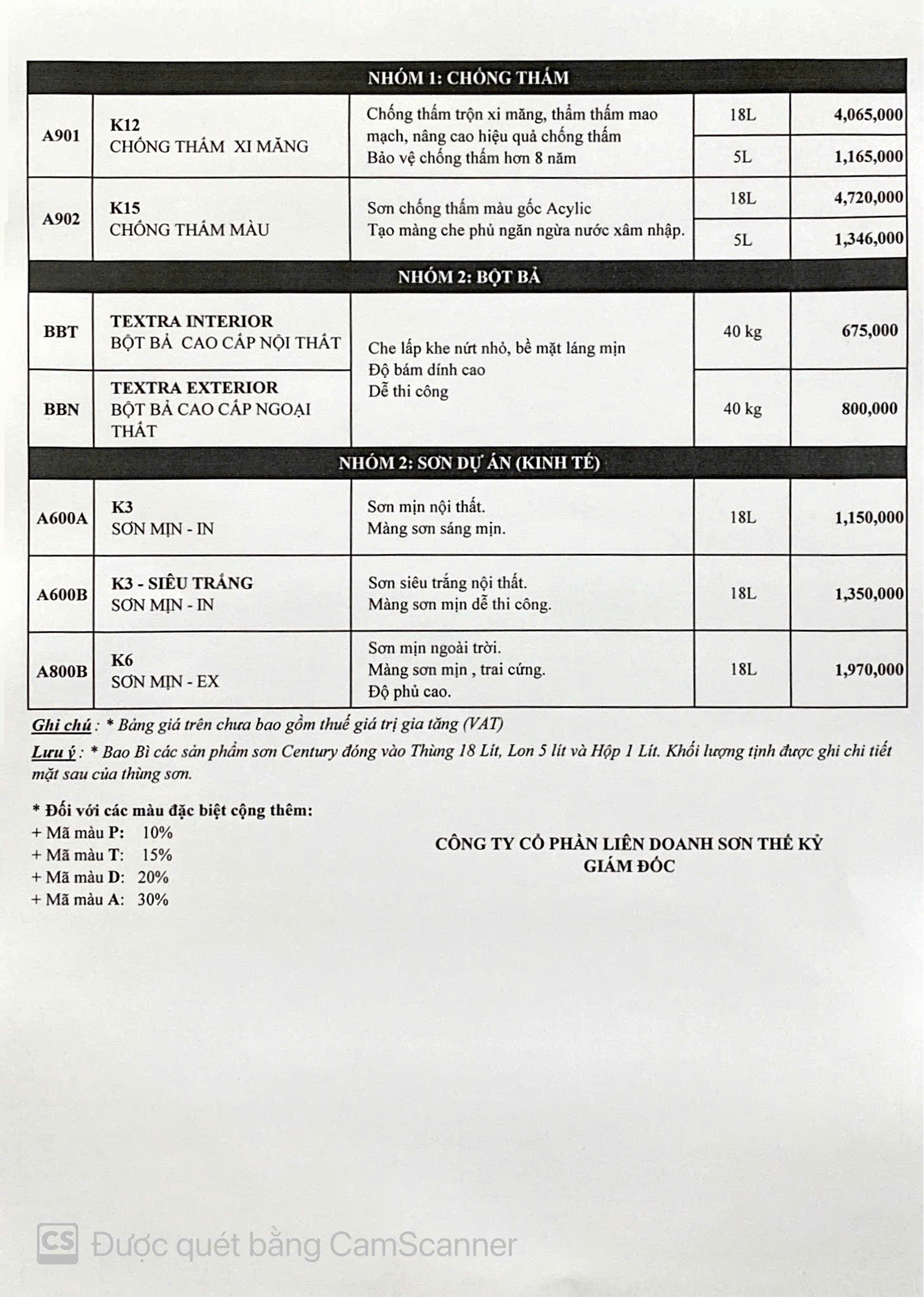 | 18L/Thùng | 6.985.000 | 5L/Lon | 1.975.000 | 1L/Lon | 405.000 |